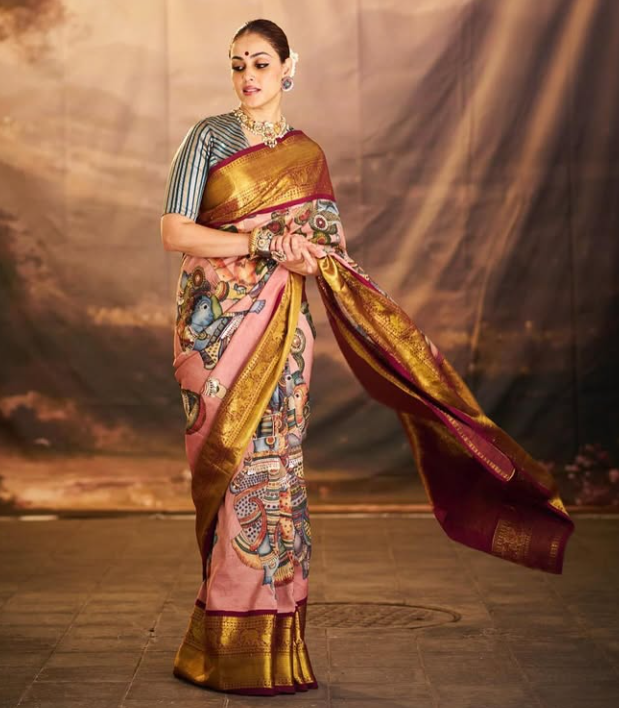 जेनेलिया ऑलिव ग्रीन कलर की बांधनी साड़ी में परफेक्ट फेस्टिव वाइब दे रही हैं. उन्होंने ब्राउन कलर के ब्लाउज के साथ इस साड़ी को पेयर किया.