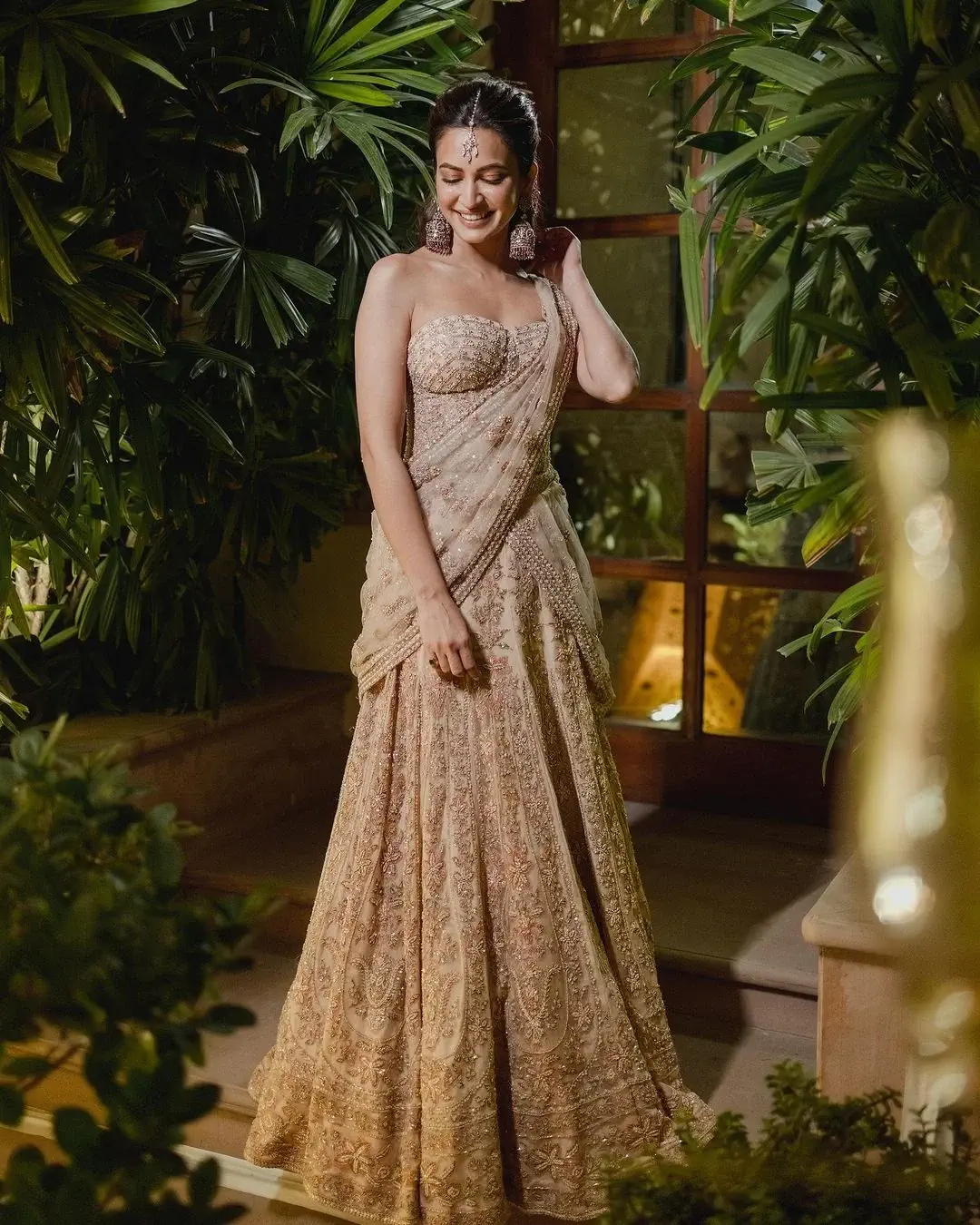 हुमा कुरैशी का ये लहंगा लुक किसी भी संगीत या सगाई पार्टी के लिए परफेक्ट है. उन्होंने ब्लश गोल्ड कलर के लहंगे को मैचिंग थ्री फोर्थ स्लीव वाले ब्लाउज के साथ कैरी किया.
