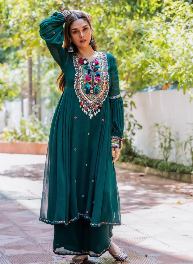 डार्क ग्रीन कलर के शरारा सूट में एक्ट्रेस बहुत खूबसूरत लग रही हैं. इसके साथ उन्होंने लंबे झुमके कैरी किए हैं और बालों को खुला छोड़ा है.